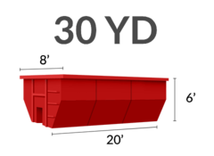 Our 30-yard dumpster is our largest bin option. This dumpster can assist with any size cleanup, commonly rented for commercial and residential use. Great for demolition, roofing, and much more.